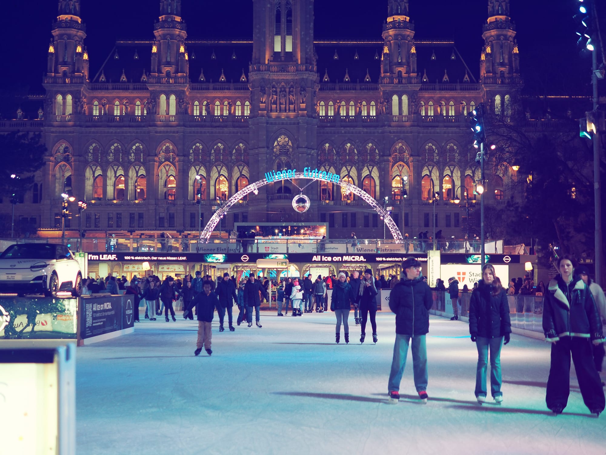 Around Rathausplatz, the illuminated ice rink introduced strong highlights, reflections, and constant movement, which required careful exposure choices.